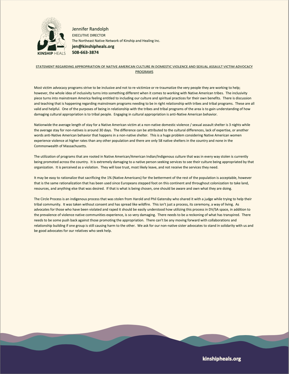 And so it falls to me today to share the following statement that should have never had to be made but that nevertheless has had to be made from the Northeast Native Network of Kinship and Healing.